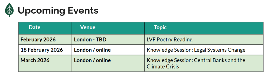 February Knowledge Session – Legal Systems Change: Join us in person at the University of Law’s Moorgate campus or online on 26 February for our first knowledge session of the year on Legal Systems Change. The session will be hosted by LVF member Vicky Vanderstichele and we will be discussing what systems theory is and how we use it to understand how we can cause systemic change, for example in ESG regulation, and what potential barriers to systemic change exist. We will be reviewing an extract from the Dawn of Everything for our creative content. Sign up to join here.